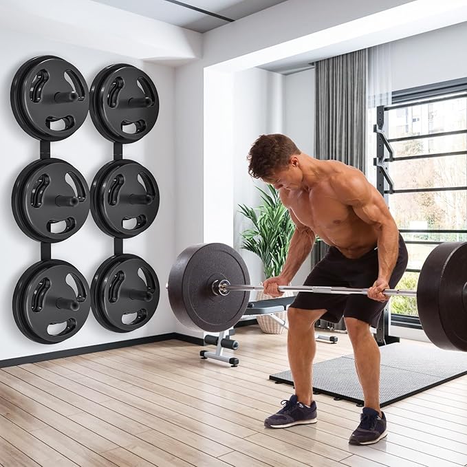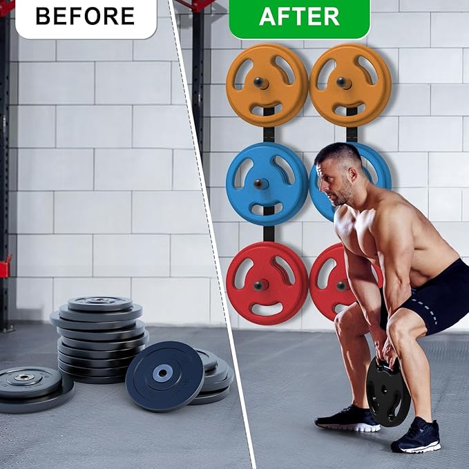 - "Noise-Reducing Protection: Equipped with rubberized pads and flake-resistant finish, our wall-mounted weight plate holder safeguards Olympic plates from scratches, dents, and workout noise"