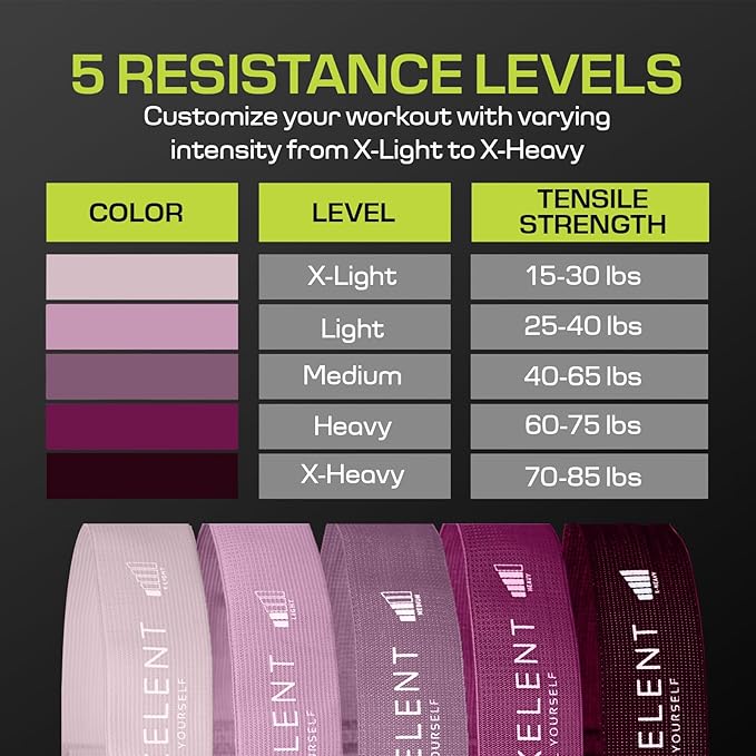 - 5 LEVEL CUSTOMIZABLE INTENSITY: With 5 resistance levels, these fabric fitness bands set offers five (5) adjustable intensity, making them perfect for beginners to advanced users. They allow you to progress at your own pace and effectively target different muscle groups for a more tailored workout.