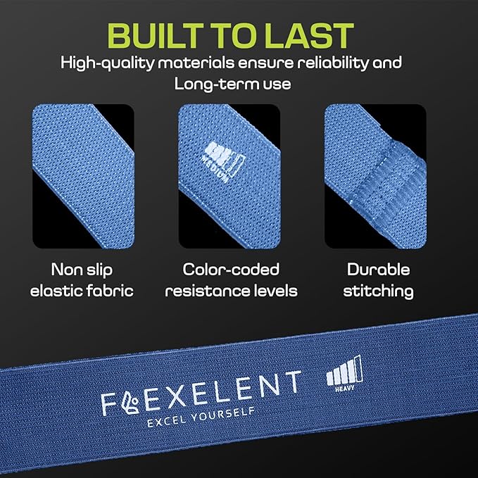 - HIGH PERFORMANCE, SUPERIOR COMFORT: Flexelent’s Blue Resistance Bands are made from soft yet thick,and skin-friendly fabric that stays in place without rolling, slipping or pinching your skin. With these fabric exercise bands resistance, you'll experience enhanced comfort and support for a more effective training session.