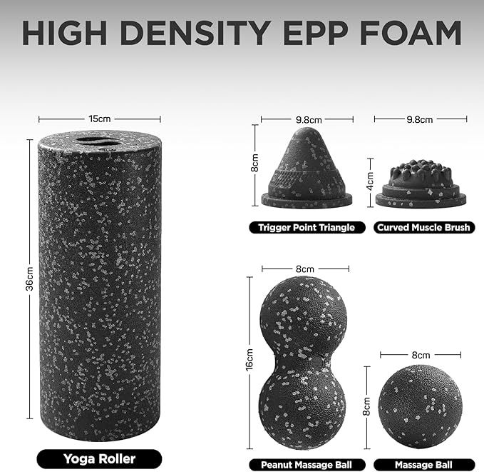 - 🌀 Hollow Design Integration System- Features an innovative hollow-core yoga roller that stores the peanut massage ball and fascia ball, securely sealed with the curved muscle brush and triangle massage cone. Assembled, it matches the size of a standard foam roller (14.5 inches) for seamless storage, while instantly transforming into 5 specialized tools when disassembled.