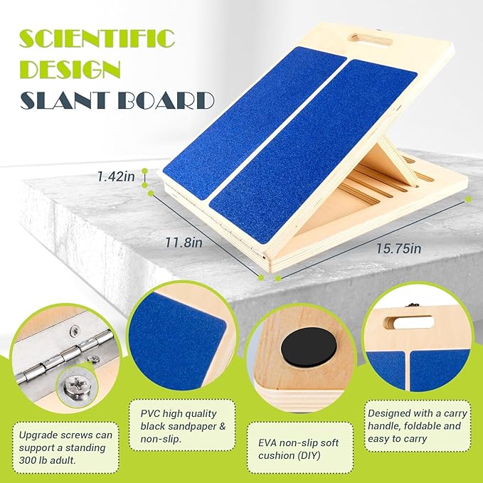 - [Scientific Design Leg Exercisers] Our calf stretcher slant board has a foldable design. A full PVC sandpaper top and a non-slip EVA base provide a better grip to prevent slipping during exercise and use.