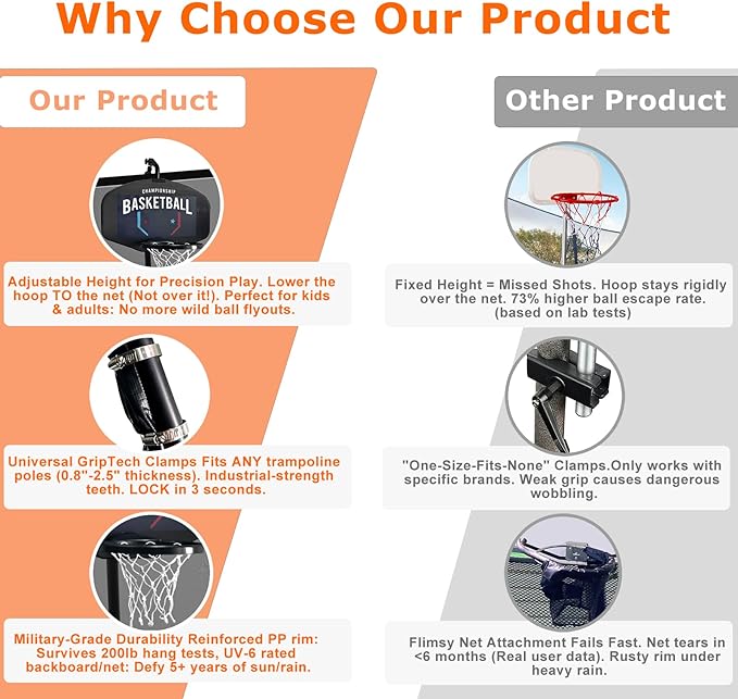 - [Smart Anti-Flyout Hoop System - Play Safe, Stay Fun] Lab-certified Anti-Flyout System - 85% fewer lost balls! 10'' height adjustment + 90° angled backboard keeps play wild but contained (no more neighbor complaints!). This trampoline basketball hoop attachment is perfect blend of kids' outdoor safety and teen slam dunk excitement.