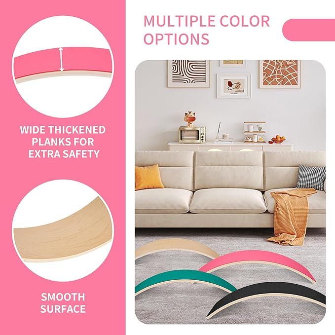 - Safe Design: Wobble Balance Board with a unique curved design that ensures stability and reduces the risk of slipping and injuries, providing a safe exercise experience for users. Its wide, thickened planks offer extra safety, and the smooth surface prevents scratches. Additionally, the anti-slip base protects your floor, and rounded corners further enhance safety, making it suitable for children and adults