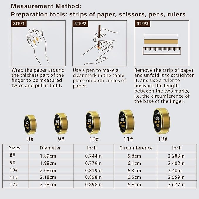 - 【Select the Right Size】: Measure your finger circumference using our size guide to ensure the best fit. The Anarow smart health ring is available in eight sizes (non-adjustable). If between sizes, choose the larger one for comfort and more stable sensor contact