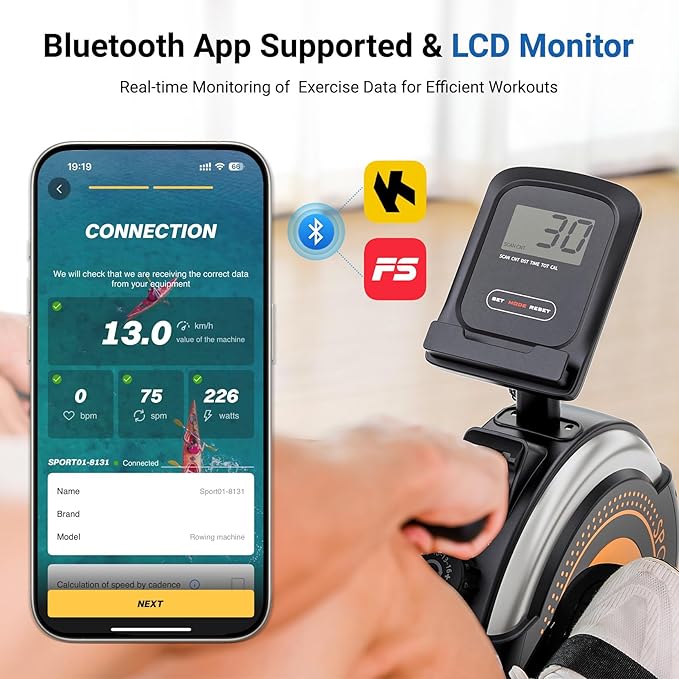 - App Compatible & Real-time Rowing Data: You can connect your smartphone or device to the rowing machine via Bluetooth, track your exercise metrics during your row, and immerse yourself in a variety of live training videos to complete passionate exercise challenges. Besides, the digital monitor accurately records every achievement, including scan, distance, time, calories, count and total count