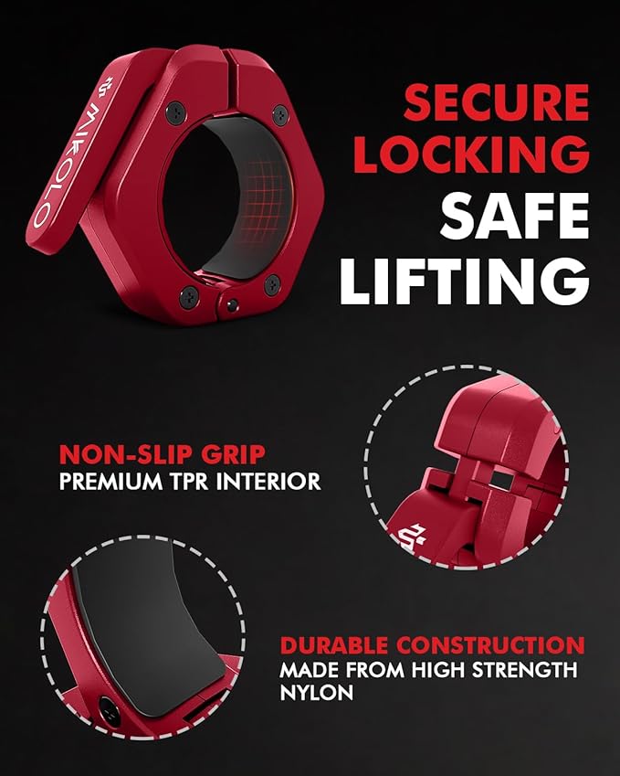 • EASY TO USE: MIKOLO Olympic barbell clamps feature a secure locking mechanism for quick installation and release—saving you time and keeping your workout momentum strong. Perfect for both home and commercial gyms
