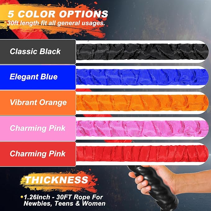 - Multicolor and Multisize Battle Ropes to Choose From: We offer black, pink, blue,orange and red battle ropes with a thickness of 1.26 / 1.5 inches and a length of 30ft length. Our battle ropes are suitable for all levels and can be used for different training purposes. The 1.26"-30FT battle rope weighs 9.5 pounds, which is suitable for beginners to conduct daily exercises at home, the 1.5"-30FT battle rope weighs 13.5 pounds and is suitable for intermediate - to - advanced professional fitness enthusiasts
