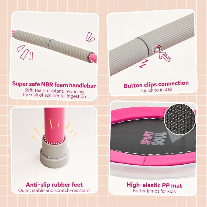 - Upgraded Safety Bar: The SPORTSOUL toddler trampoline indoor features NBR non-slip foam balance handle, soft yet durable, tear-resistant and minimization of ingestion risk. 6 rubber feet protect floors from potential scratches, quiet and steady, perfect for indoor and outdoor sports