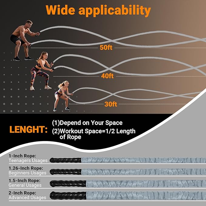 • Suitable For All Levels And Can Be Used For Different Training Purposes: Exercise rope has three thicknesses of 1.26 inches, 1.5 inches, and 2 inches, with a length of 30 feet. The 1.26"-30FT one weighs 9.5 pounds, which is suitable for beginners to conduct daily exercises at home; the 1.5"-30FT one weighs 14.5 pounds, suitable for intermediate - to - advanced professional fitness enthusiasts; the 2"-30FT one weighs 23.5 pounds, suitable for advanced professional fitness people.