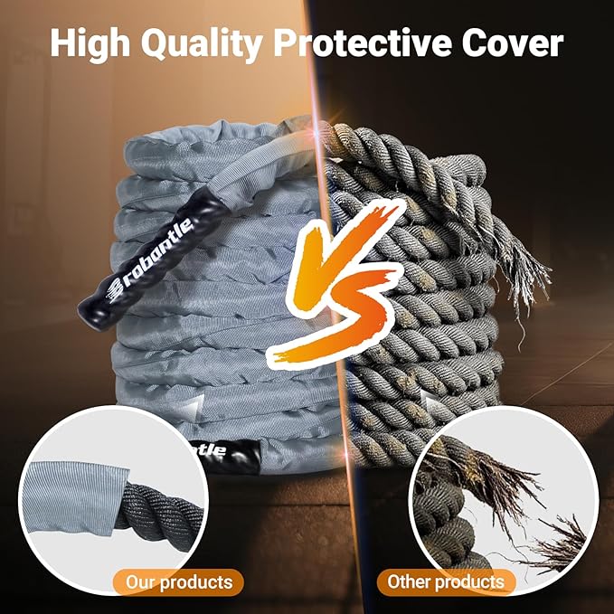• Ultra-durable Structured Professional Battle Rope: The battle rope is made of durable three-strand 100% polyester filament material. A nylon protective cover is added on the outer layer. The high-tensile-strength exercise rope can prevent breakage, wear, or loosening, and is more durable than other exercise ropes without protective covers. This is a good choice for fitness enthusiasts for workouts in home gyms and outdoors.