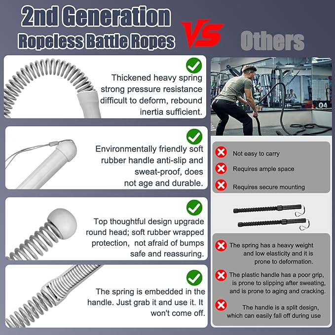 - ✅【Sturdy And Durable, Strong Rebound Inertia】This ropeless battle ropes uses high-quality stainless steel thickened springs, stable rebound, more rebound force, and can withstand conventional high-intensity training. High-precision electroplating coloring process, anti-oxidation, anti-wear, no fading Efficient exercise, continuous high-frequency vibration, eccentric contraction of core muscles. Compared with traditional battle ropes, it is more concise and durable, eliminating the risk of entanglement or wear.