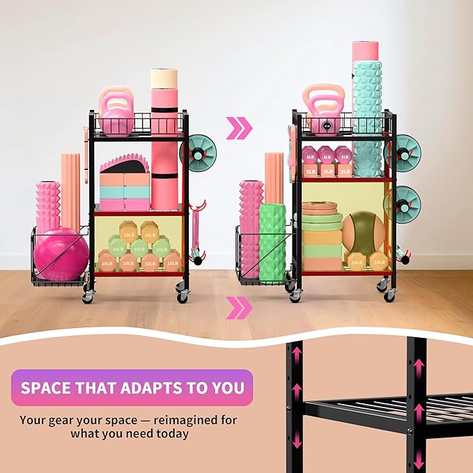 • [Adjustable & All-in-One Storage Solution]: This weight rack for home gym features an adjustable height design, allowing you to customize the spacing for different items like yoga mats, foam rollers, dumbbells, kettlebells, and resistance bands. With 3 tiers, side basket, and multiple hooks, this home gym storage rack keeps all your workout gear organized in one compact place.