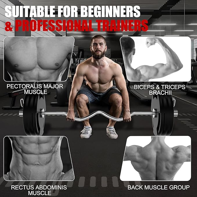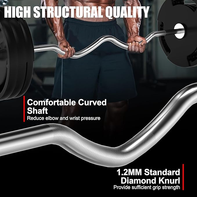- ERGONOMIC COMFORT & WRIST RELIEF: The expertly crafted curved shaft positions your hands and wrists at a natural, comfortable angle. This ergonomic design significantly reduces strain on your wrists and forearms, allowing you to focus on your form and maximize your bicep and tricep workouts.