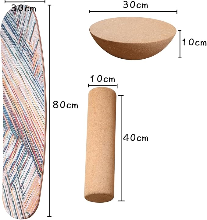 - DIMENSIONS: Premium balance board measures 31.5 inches long x 11.8 inches wide, paired with a 17.7-inch cork roller and 2.4-inch balance ball for versatile training
