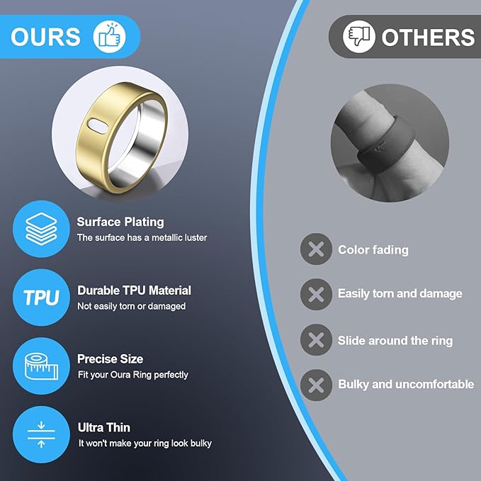 - 【Ultra Thin & Comfortable】Our oura ring covers adapt an ultra-thin design. It won't make your oura ring look too bulky. It is comfortable & skin-friendly, which won't cause allergies or discomfort to your fingers. Perfect for protecting the oura ring from damage during workout or daily wear.