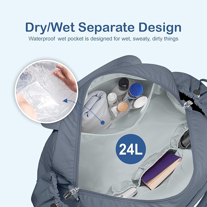 TOPDesign Travel Duffel Bag for Women, Puffer Gym Bag Sports Tote with Wet Pocket, Carry On Weekender with Luggage Sleeve (Blue Grey)