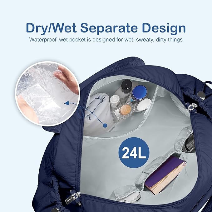 TOPDesign Travel Duffel Bag for Women, Puffer Gym Bag Sports Tote with Wet Pocket, Carry On Weekender with Luggage Sleeve (Navy Blue)