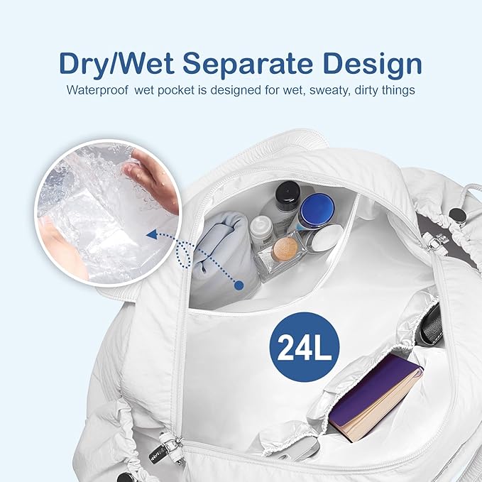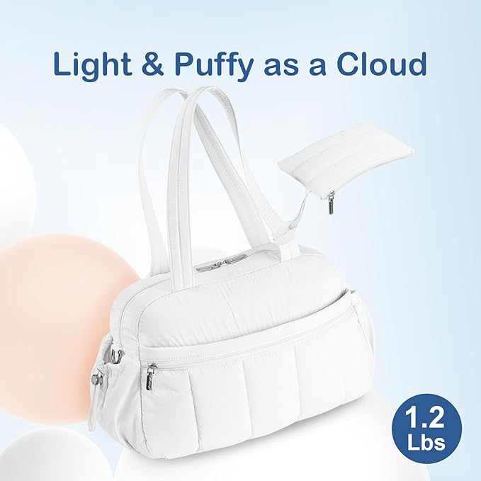 TOPDesign Travel Duffel Bag for Women, Puffer Gym Bag Sports Tote with Wet Pocket, Carry On Weekender with Luggage Sleeve (White)