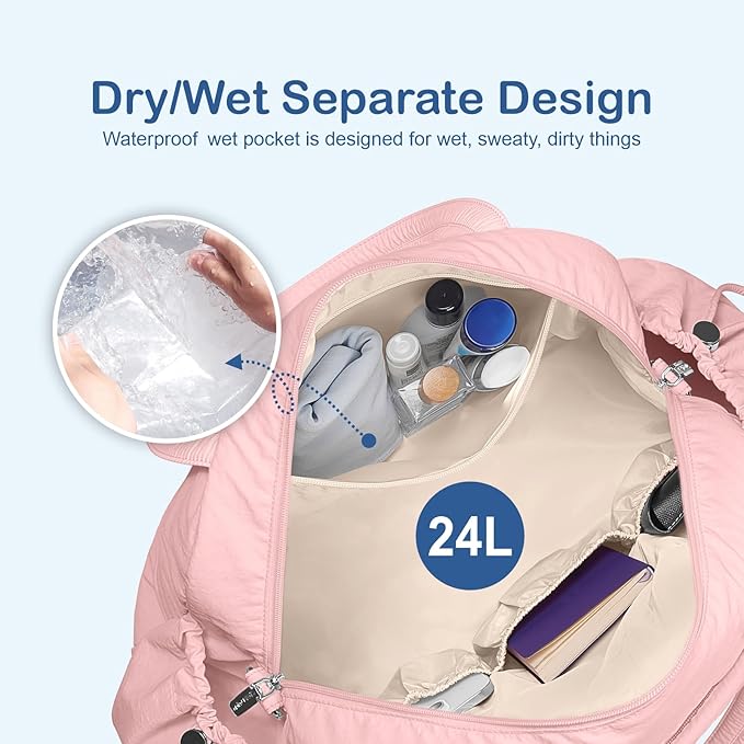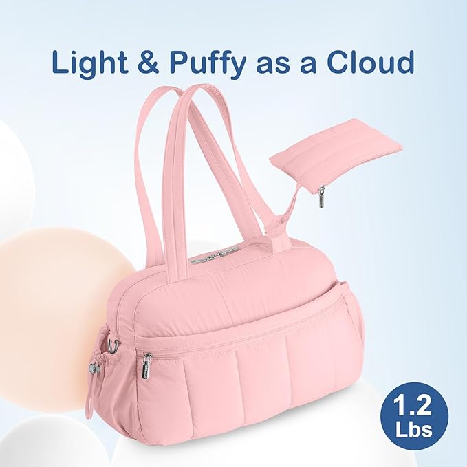 TOPDesign Travel Duffel Bag for Women, Puffer Gym Bag Sports Tote with Wet Pocket, Carry On Weekender with Luggage Sleeve (Baby Pink)