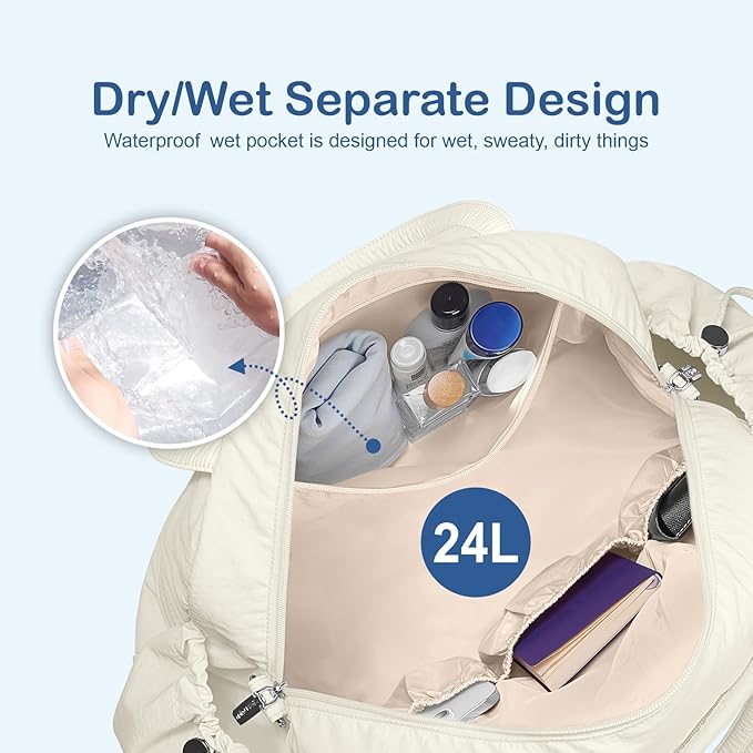 TOPDesign Travel Duffel Bag for Women, Puffer Gym Bag Sports Tote with Wet Pocket, Carry On Weekender with Luggage Sleeve (Ivory White)