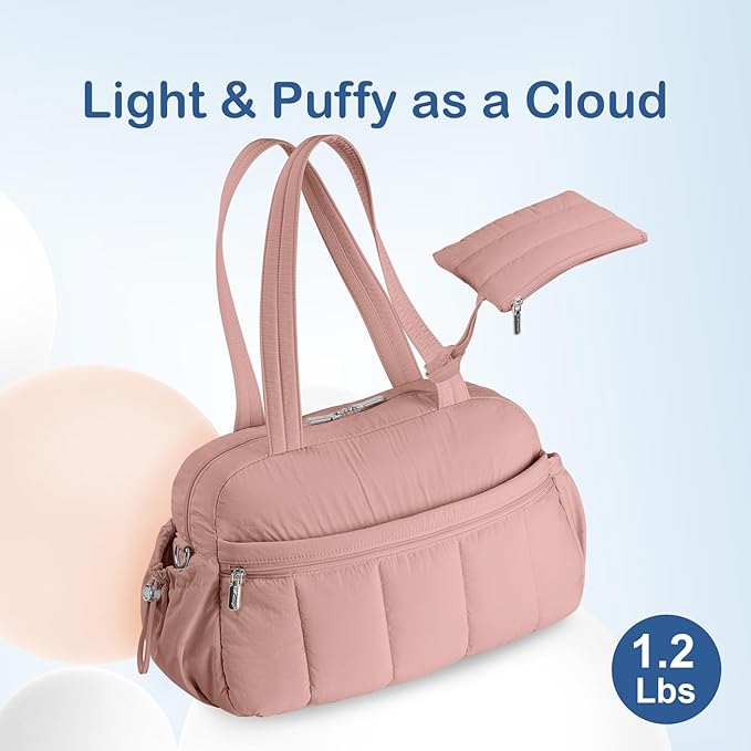 - ORGANIZED PREMIUM STORAGE: Measuring 17 x 7.5 x 12 inches, keep your daily outings thoroughly organized with style all over. A fully lined interior along with 3 slip pockets, a zippered waterproof PVC pocket specially designed for wet/dirty items. The exterior features 2 zippered pockets, 2 side drawstring pockets for storing water bottles. In addition, this quilted puffy gym bag also comes with a toiletry bag for your cosmetics.