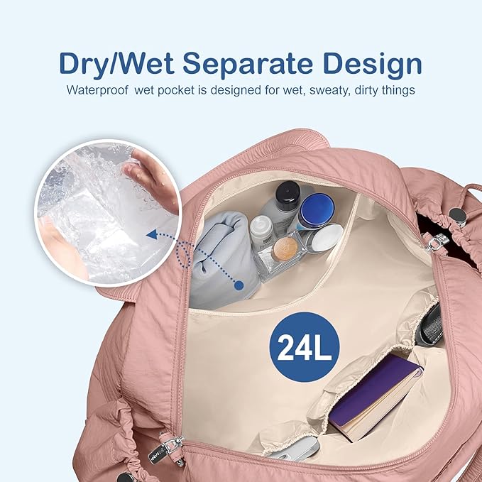 TOPDesign Travel Duffel Bag for Women, Puffer Gym Bag Sports Tote with Wet Pocket, Carry On Weekender with Luggage Sleeve (Dark Pink)