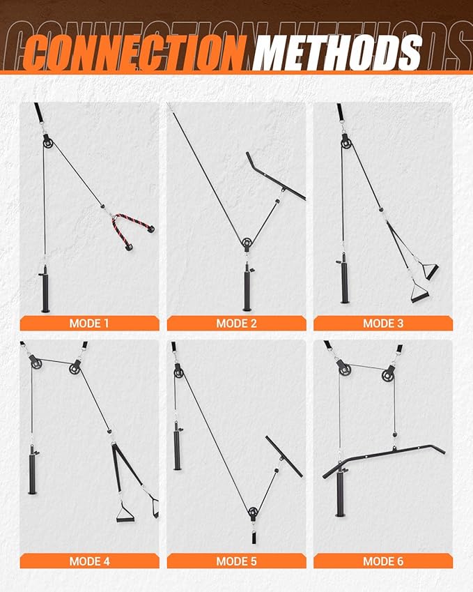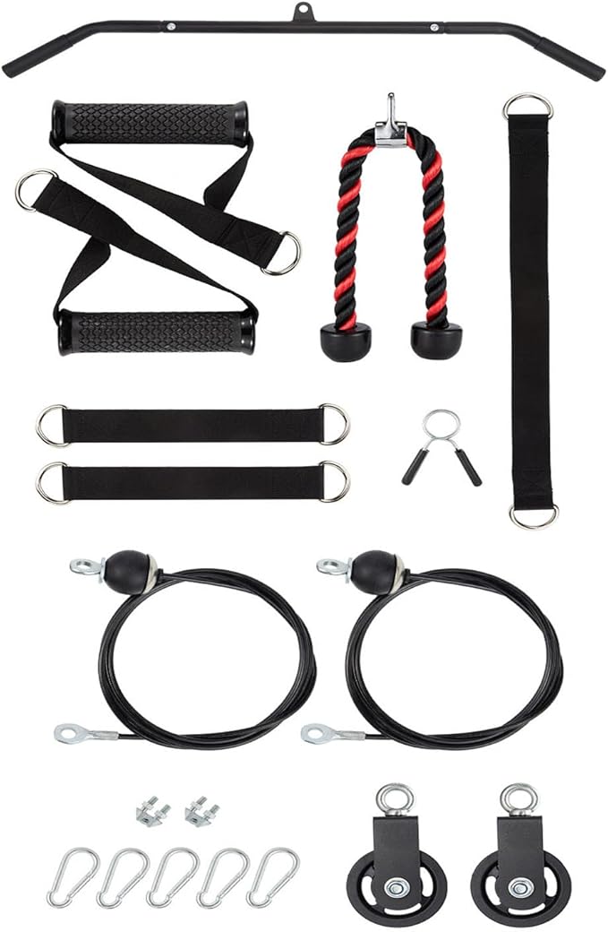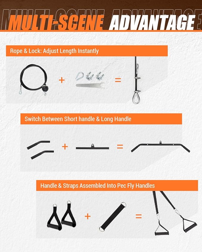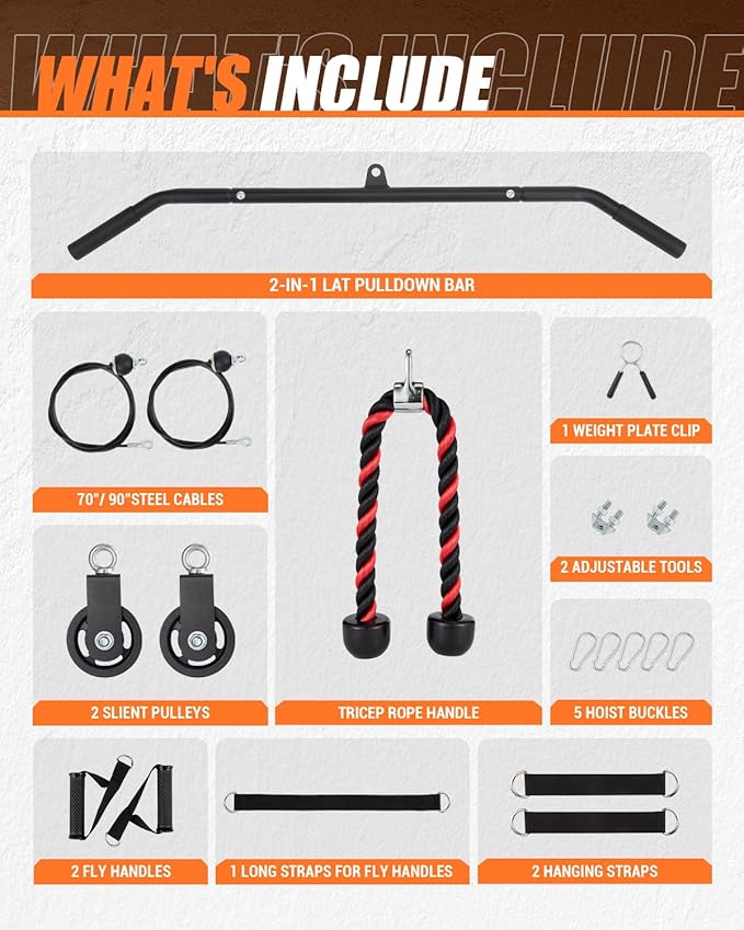 - Multi-Functional Lat Pulldown Attachments: This pulley system for home gym includes four versatile cable attachments—a lat pulldown bar, tricep rope, and dual fly handles—to support bicep curls, tricep pushdowns, lat pulldowns, rows, and flys. Perfect gym attachments for cable machines and smith machine accessories, enhancing strength training variety