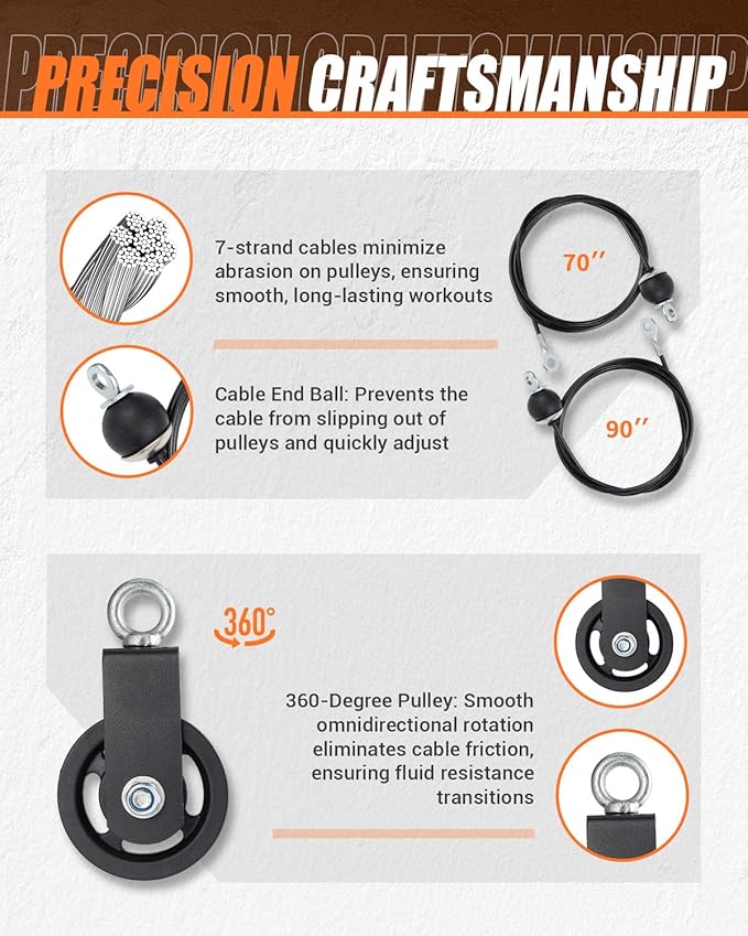 - Solid & Safe Cable Pulley System: Built from heavy-duty steel pulleys and reinforced cables (70" & 90"), this gym pulley system offers rock-solid stability and durability. Designed to withstand intense workouts, it's a must-have power rack attachment that ensures no slips or breakage during your strength training sessions