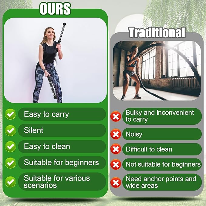 - ✅Exercise Anytime, Anywhere: Compared with traditional battle ropes, this cordless battle rope does not require a wide space and anchor fixation, and there is no noise during the swinging process. Allowing you to exercise anytime, anywhere without being limited by time and location.