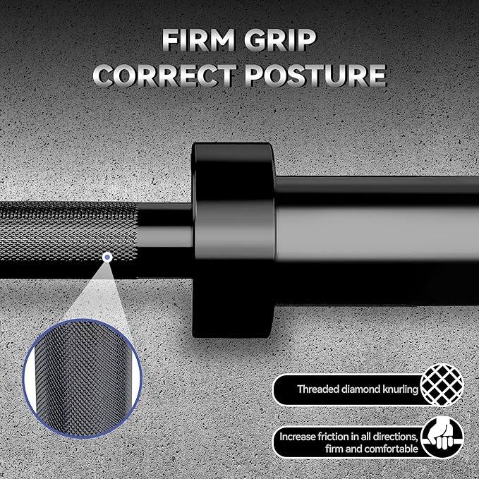- 【Superior Knurled Grip for Safety & Control】 Features aggressive knurling on the bar to prevent slipping during deadlifts, squats, or bench presses. The ergonomic grip design enhances comfort and reduces hand fatigue, ensuring secure handling even during high-rep strength training workouts.