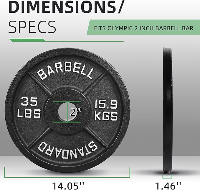 • Made of solid cast iron with a 2-inch center hole, it fits Olympic bars with diameter of 2". It can also be used with 2" dumbbell bars.