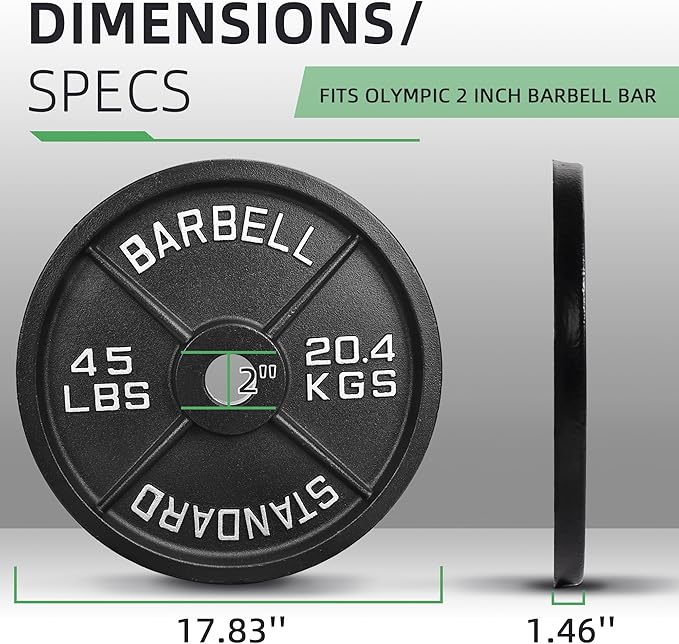 • Made of solid cast iron with a 2-inch center hole, it fits Olympic bars with diameter of 2". It can also be used with 2" dumbbell bars.