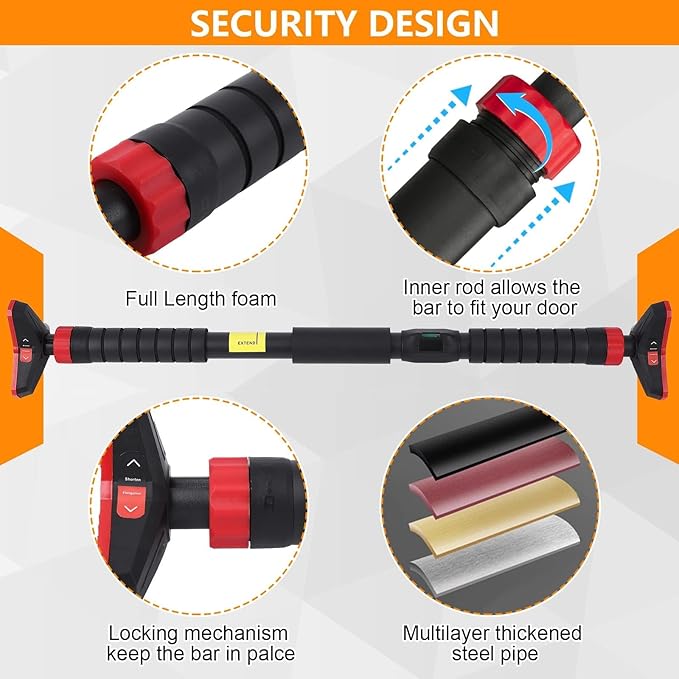 - Adjustable Width with Level Meter:Customize from 27.6" to 36.2" (70-92cm) to fit any standard doorway. Built-in horizontal bubble level ensures perfect balance – arrow alignment guarantees safe pull-ups, chin-ups, and leg raises.