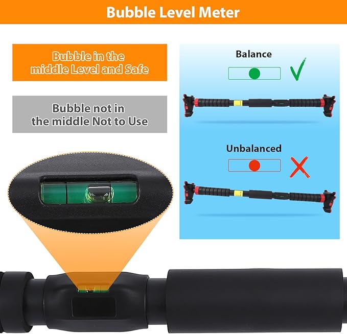 - Adjustable Width with Level Meter:Customize from 27.6" to 36.2" (70-92cm) to fit any standard doorway. Built-in horizontal bubble level ensures perfect balance – arrow alignment guarantees safe pull-ups, chin-ups, and leg raises.