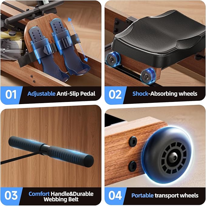 - 180° Foldable Design: The innovative quick-folding design allows the rowing machines fold 180° effortlessly without any tools. With bottom wheels for easy movement and storage, can save space in your home. Elegant appearance with wooden design, very suitable for home space.
